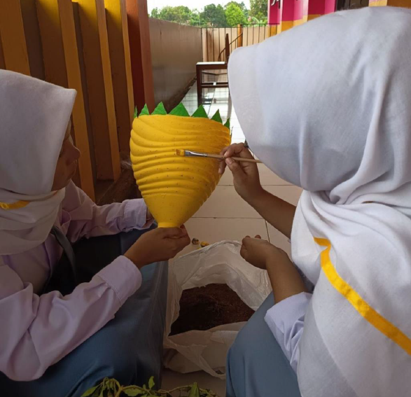 Salah satu kegiatan unggulan sekolah yang rutin dilakukan adalah daur ulang sampah galon bekas menjadi media tanam. Galon-galon yang sudah tidak terpakai dimodifikasi menjadi pot tanaman yang menarik dan fungsional. Siswa diajak untuk memotong, menghias, hingga menanam berbagai jenis tanaman hias maupun tanaman produktif seperti sayuran. Kegiatan ini tidak hanya mengurangi jumlah sampah plastik, tetapi juga memperindah lingkungan sekolah dengan sentuhan hijau yang asri. Selain itu, program ini menjadi sarana pembelajaran kontekstual yang menggabungkan aspek kreativitas, kewirausahaan, dan kepedulian lingkungan dalam satu kegiatan yang menyenangkan.